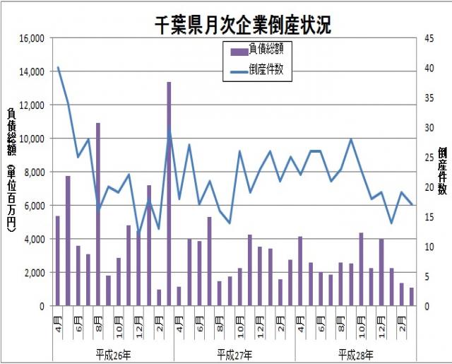 東京商工リサーチより、平成29年3月の千葉県内企業の倒産件数が発表されました。倒産件数は17件、負債総額は10億9,100万円とのことです。倒産件数は前年同月と比較して8件減少し、負債総額も約16億円減少しています。