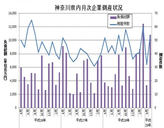 東京商工リサーチより、平成29年5月の神奈川県内企業倒産件数が発表されました。倒産件数は53件、負債総額は108億400万円とのことです。倒産件数は前年同月と比較して12件増加し、負債総額も約76億円増加しています。