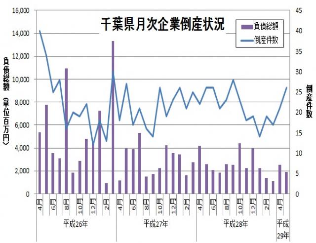 東京商工リサーチより、平成29年5月の千葉県内企業の倒産件数が発表されました。倒産件数は26件、負債総額は18億7,200万円とのことです。倒産件数は前年同月と同じ件数、負債総額は約7億円減少しています。