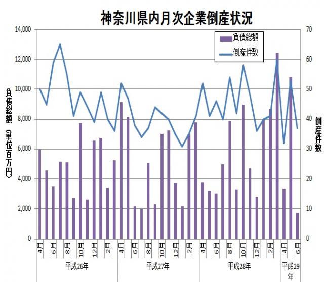 東京商工リサーチより、平成29年6月の神奈川県内企業倒産件数が発表されました。倒産件数は37件、負債総額は17億2,100万円とのことです。倒産件数は前年同月と比較して9件減少し、負債総額も約13億円減少しています。