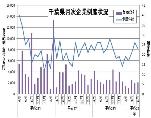 東京商工リサーチより、平成29年6月の千葉県内企業の倒産件数が発表されました。倒産件数は23件、負債総額は20億4,500万円とのことです。倒産件数は前年同月より3件減少、負債総額は約1千万円減少しています。