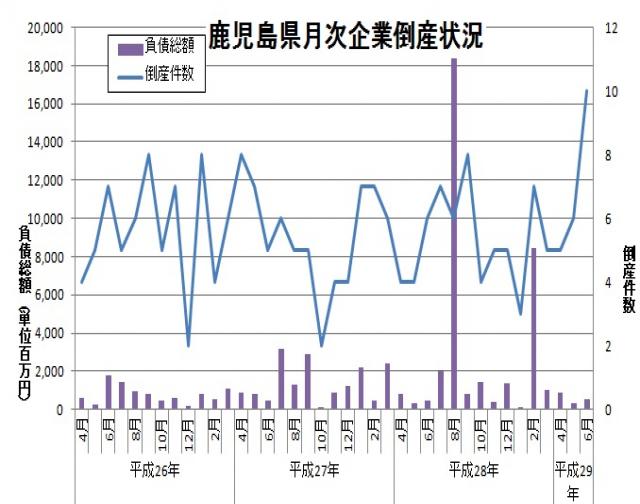 東京商工リサーチより、平成29年6月の鹿児島県内企業の倒産件数が発表されました。倒産件数は10件、負債総額は5億100万円とのことです。倒産件数は前年同月と比較して4件増加、負債総額は約2千5百万円増加しています。