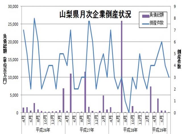 東京商工リサーチより、平成29年8月の山梨県内企業の倒産件数が発表されました。倒産件数は3件、負債総額は1億6,300万円とのことです。倒産件数は前年同月と比較して2件増加し、負債総額は約1億円増加しています。