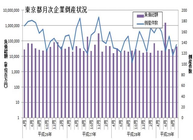 東京商工リサーチより、平成29年9月の東京都内企業の倒産件数が発表されました。倒産件数は136件、負債総額は432億1,200万円とのことです。倒産件数は前年同月と比較して33件増加し、負債総額は190億円増加しています。負債額上位には(株)YOZAN(通信事業)143億100万円破産手続をしています。