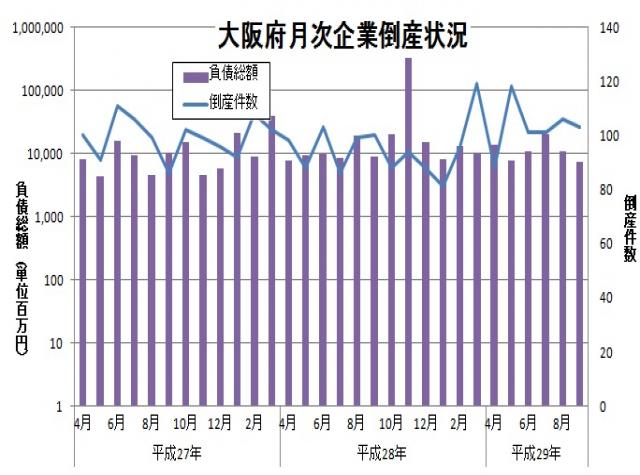 東京商工リサーチより、平成29年9月の大阪府企業の倒産件数が発表されました。倒産件数は103件、負債総額は74億8,100万円とのことです。倒産件数は前年同月と比較して3件増加、負債総額は約13億円減少しています。