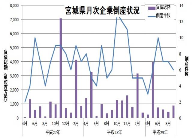 東京商工リサーチより、平成29年9月の宮城県内企業の倒産件数が発表されました。倒産件数は6件、負債総額は8億9,700万円とのことです。倒産件数は前年同月と比較して同件数、負債総額は約3億円増加しています。
