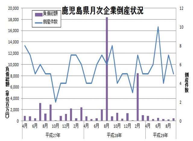 東京商工リサーチより、平成29年9月の鹿児島県内企業の倒産件数が発表されました。倒産件数は5件、負債総額は4億4,000万円とのことです。倒産件数は前年同月と比較して3件減少し、負債総額は約4億円減少しています。