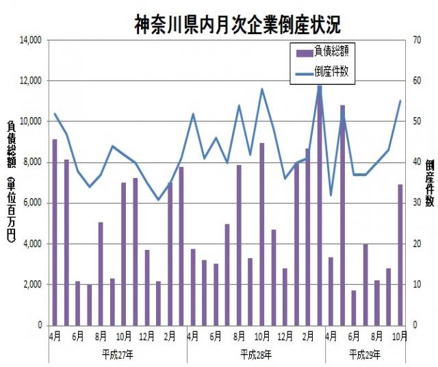 東京商工リサーチより、平成29年10月の神奈川県内企業倒産件数が発表されました。倒産件数は55件、負債総額は69億3,600万円とのことです。倒産件数は前年同月と比較して3件減少、負債総額は約20億円減少しています。