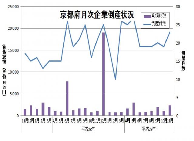 東京商工リサーチより、平成29年11月の京都府内企業の倒産件数が発表されました。倒産件数は23件、負債総額は23億3,000万円とのことです。倒産件数は前年同月と比較して2件増加し、負債総額は約12億円増加しています。