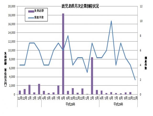 東京商工リサーチより、平成29年11月の鹿児島県内企業の倒産件数が発表されました。倒産件数は2件、負債総額は6,000万円とのことです。倒産件数は前年同月と比較して3件減少、負債総額は約3億2,000円減少しています。