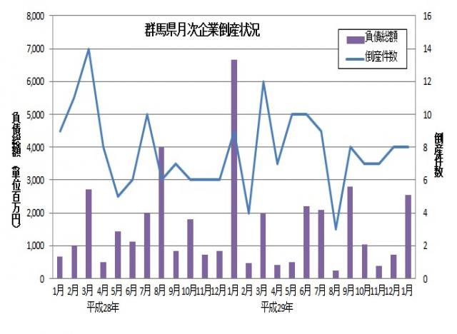 東京商工リサーチより、平成30年1月の群馬県内企業の倒産件数が発表されました。倒産件数は8件、負債総額は25億4,500万円とのことです。倒産件数は前年同月と比較して1件減少、負債総額は約41億円減少しています。