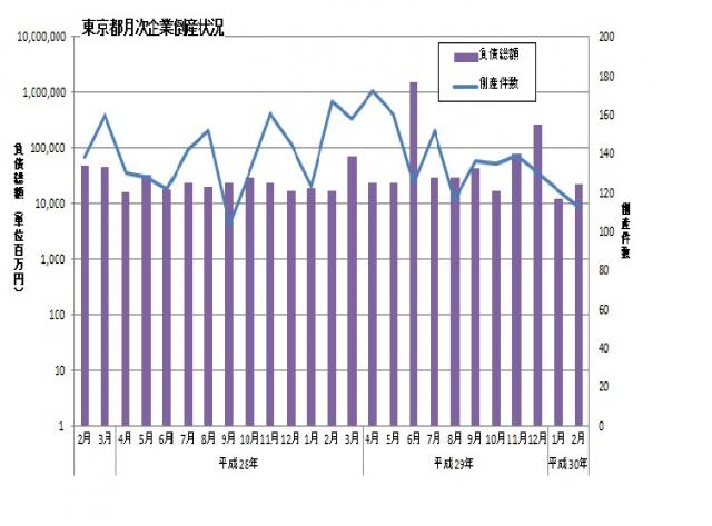 東京商工リサーチより、平成30年2月の東京都内企業の倒産件数が発表されました。倒産件数は112件、負債総額は220億1,000万円とのことです。倒産件数は前年度月と比較して55件減少し、負債総額は47億円増加しています。
