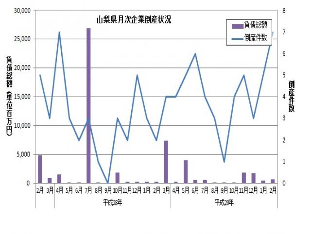 東京商工リサーチより、平成30年2月の山梨県内企業の倒産件数が発表されました。倒産件数は7件、負債総額は7億2,000万円とのことです。倒産件数は前年度月と比較して5件増加し、負債総額は約5億円増加しています。