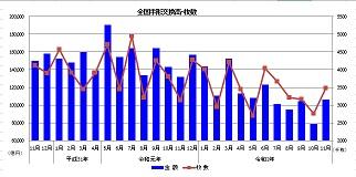 [最新]手形割引など手形交換高等の発表 令和2年12月22日発表の手形の交換高と枚数 手形割引などの手形の現金化や手形の取立によって令和2年11 月中に全国の手形交換所に持ち込まれて手形が現金化された金額(手形交換高)は106,568億円、枚数は3,478千枚となりました。対前年同月比で交換高19.07%減、枚数は10.98%増です。 (全国銀行協会2020年12月22日発表値)