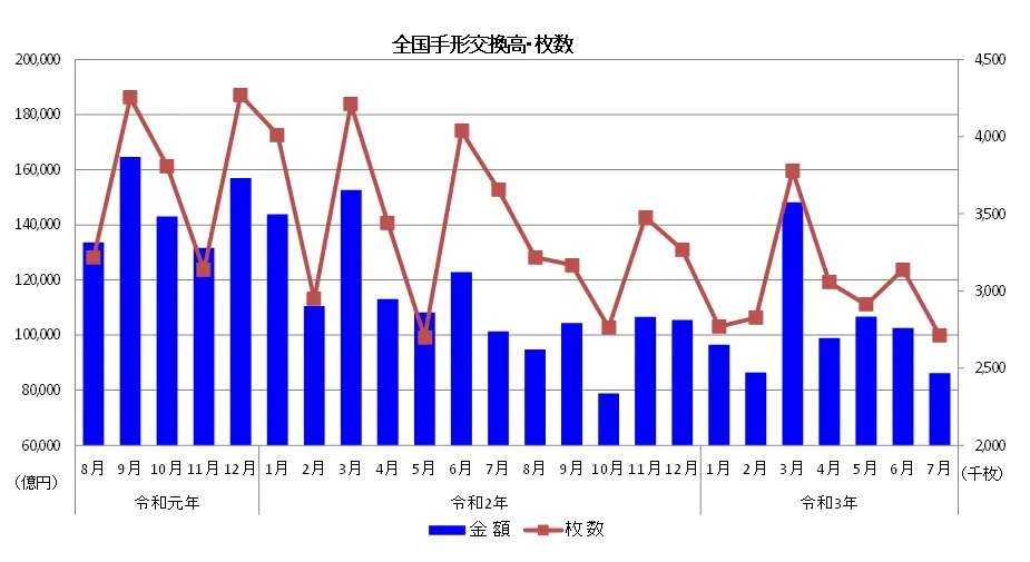 令和3年8月23日発表の手形交換高と枚数 手形割引などの手形の現金化や手形の取立によって令和3年7月中に全国の手形交換所に持ち込まれて手形が現金化された金額(手形交換高)は8兆6,237億円、枚数は2,710千枚となりました。 対前年同月比で交換高14.93%減、枚数は25.94%減です。 (全国銀行協会2021年8月23日発表値)