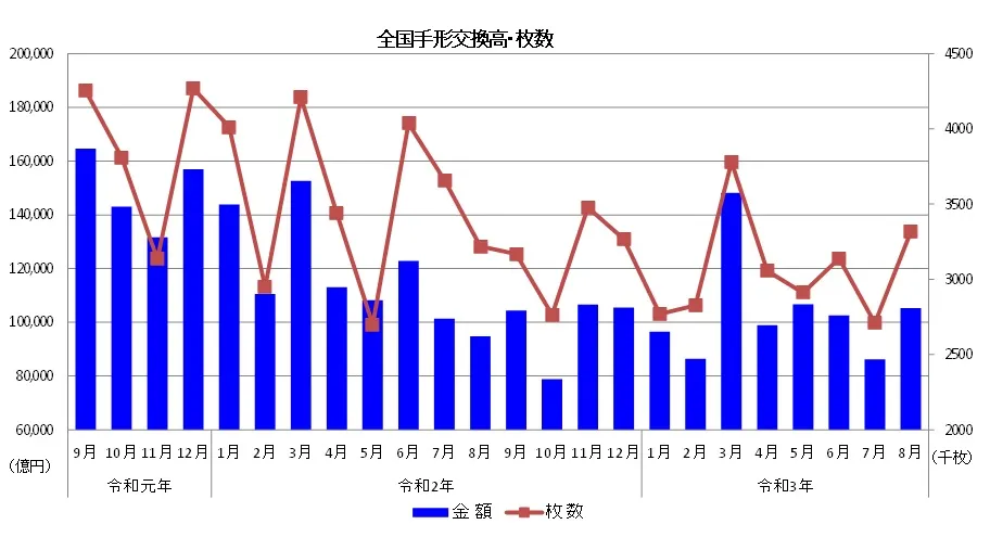 令和3年9月22日発表の手形交換高と枚数 手形割引などの手形の現金化や手形の取立によって令和3年8月中に全国の手形交換所に持ち込まれて手形が現金化された金額(手形交換高)は10兆5,255億円、枚数は3,317千枚となりました。 対前年同月比で交換高11.04%増、枚数は3.04%増です。 交換高と枚数がともに前年比プラス(+)になるのは、令和元年9月以来です。 (全国銀行協会2021年9月22日発表値)